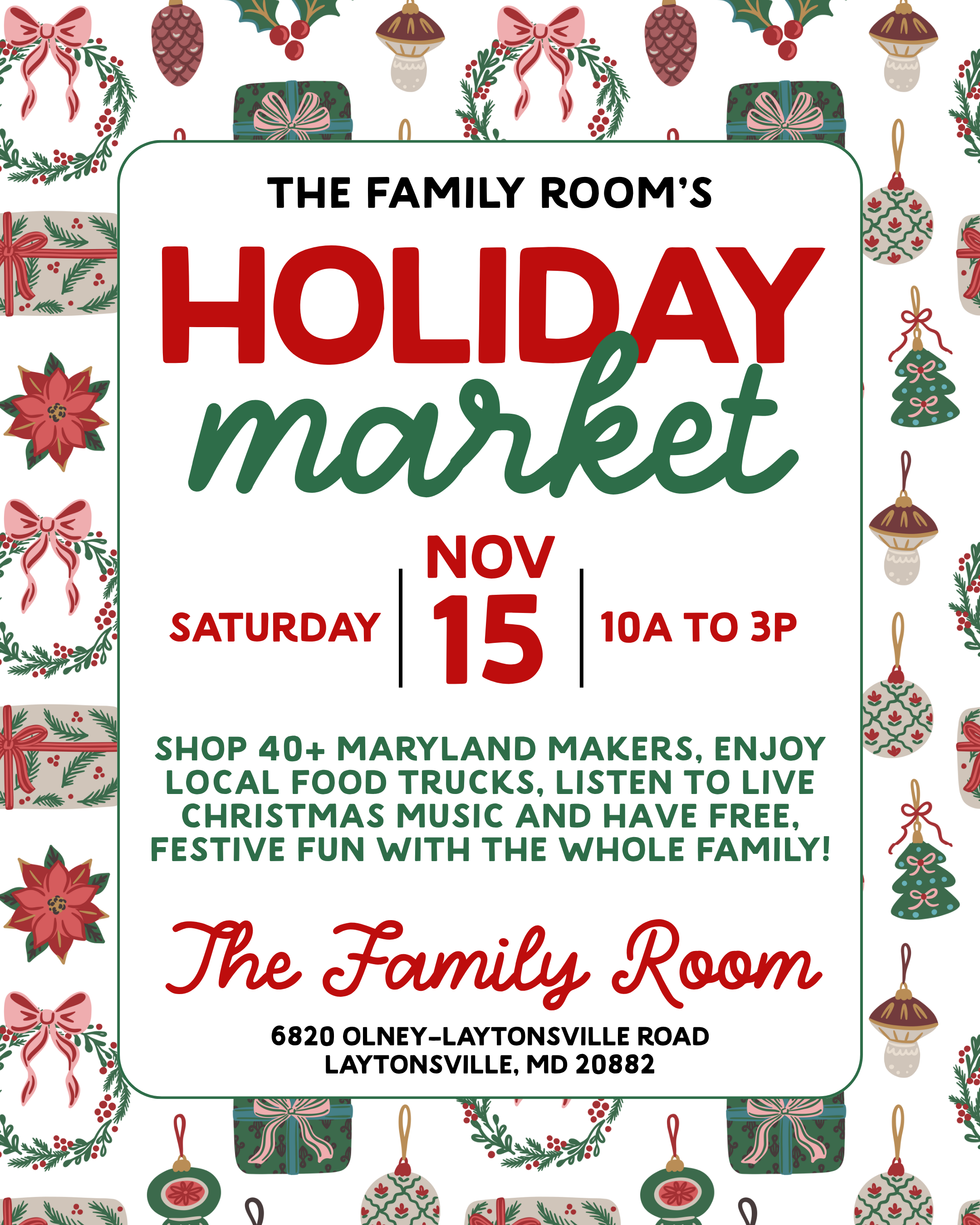 It's the most wonderful time of the year! Join us for a special Holiday Market at The Family Room, featuring local artists & vendors ready to help you accomplish all of your holiday shopping needs and share their goods with our community! You will find holiday spirit, festive eats and drinks, one of a kind gifting from local Maryland Makers and fun for the whole family! Enjoy holiday music from local young pianist Casey Didden! Join us for this fun free holiday event - making spirts bright! ✨
